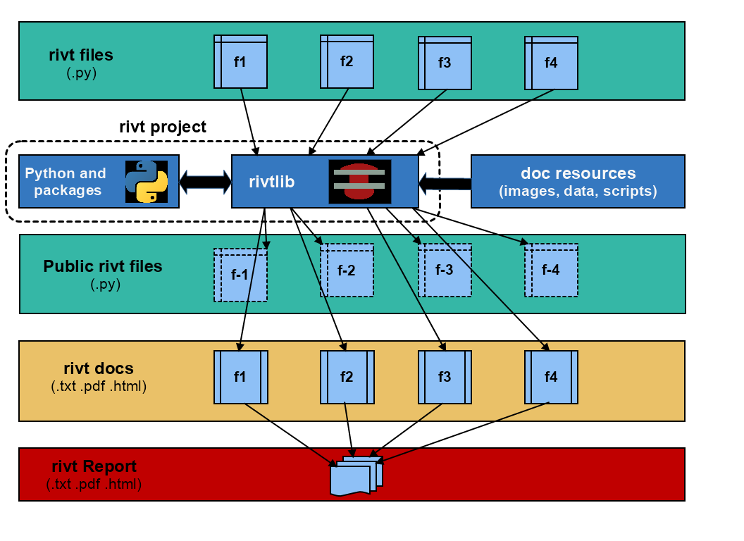 A rivt file publishes a formatted rivt doc as a text, PDF or HTML file. A rivt file is a Python file (.py) that imports the rivtlib Python package and includes rivt markup. A collection of rivt docs may be collated as a rivt report.
