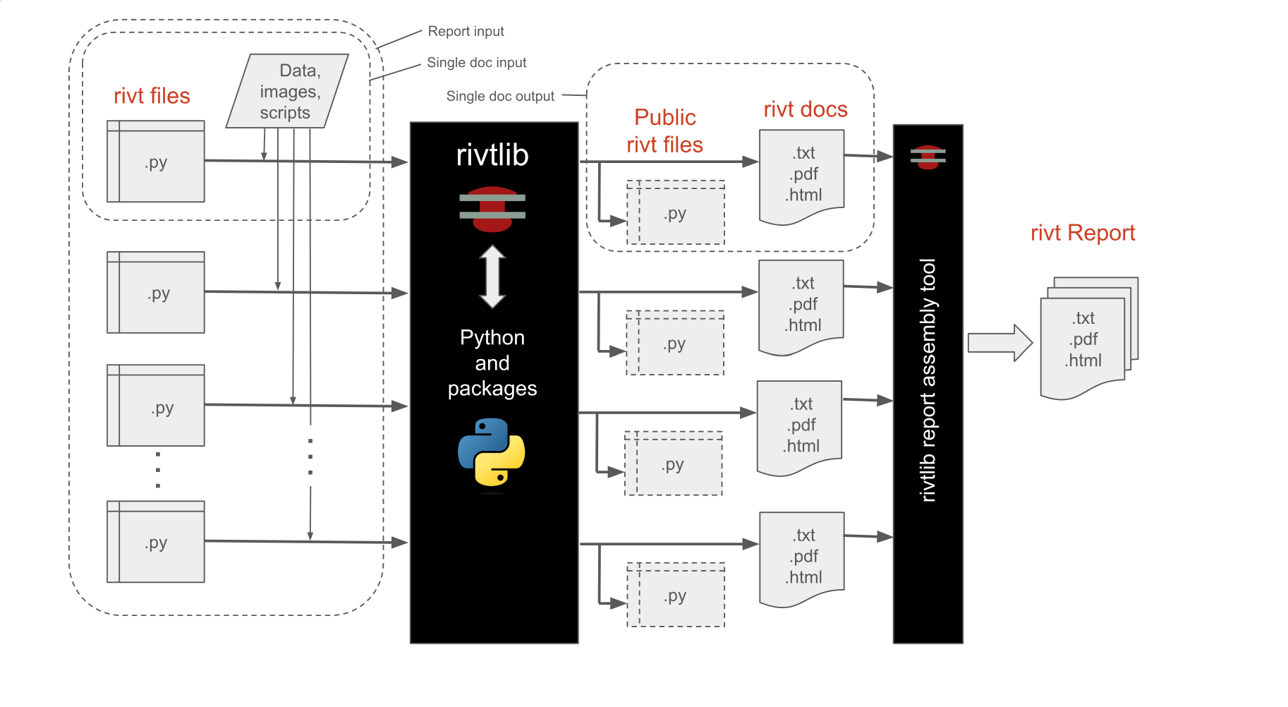 A rivt file publishes a formatted rivt doc as a text, PDF or HTML file. A rivt file is a Python file (.py) that imports the rivtlib Python package and includes rivt markup. A collection of rivt docs may be collated as a rivt report.